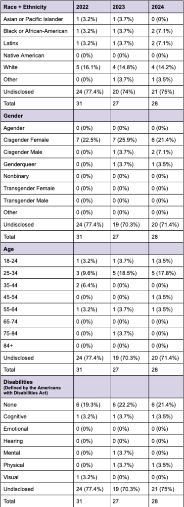 - For accountability and transparency on that commitment, we are publicly releasing a report on the racial and ethnic makeup of our artistic and administrative staff, as well as our Board of Directors and Advisory Council, every summer. We hope other companies will follow our example and release similar reports for their own accountability and transparency in anti-racist work.