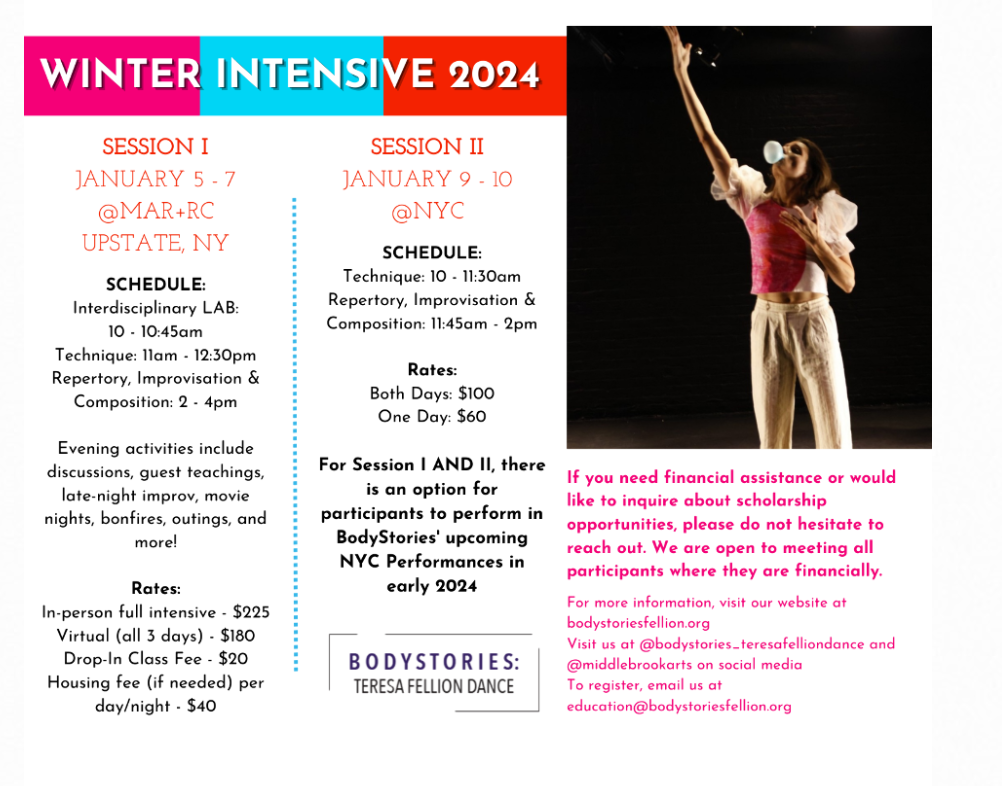 Spaces are limited! To register, email us at education@bodystoriesfellion.org. Join us this winter with BodyStories and take your artistry to the next level.