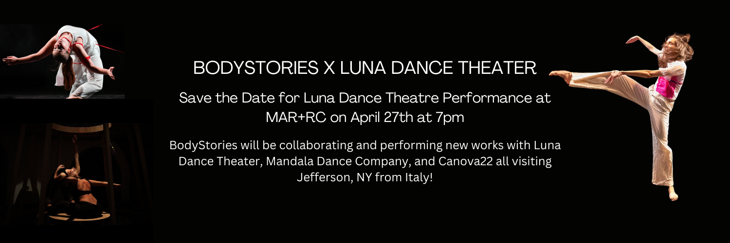 As part of this residency, BodyStories will be performing new works with Luna Dance Theater and Mandala Dance Company this weekend! This six person performance will be the first time it is performed internationally, and myself and two Italian choreographers are co-creating the work. Please join us at MAR+RC on Saturday, April 27th at 7:30 pm for this very special collaborative performance. Suggested donation is $15. We would love to see you there!