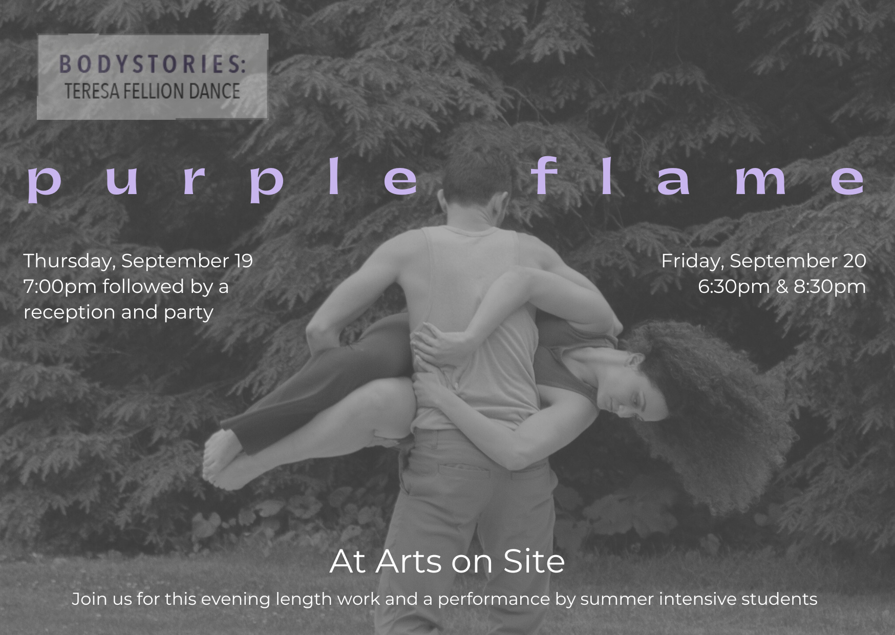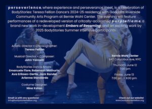 These performances will share the essence of our most recent work. We are proud to present a newly redeveloped p u r p l e f l a m e, the company’s newest original work Embers of Becoming, and a new production from our 2025 Summer Intensive Participants! We have been working on these materials throughout 2024-2025, and are filled with excitement during our home stretch of preparations to share this work with you!