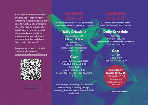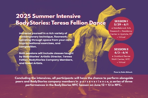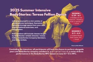 Bonus Opportunity: Participants from either/both of the sessions are invited to perform with BodyStories during our NYC season, p e r s e v e r i e n c e, on June 12 + 13 at the Bernie Wohl Center. Rehearsals will follow the intensive sessions to prepare you for the stage!